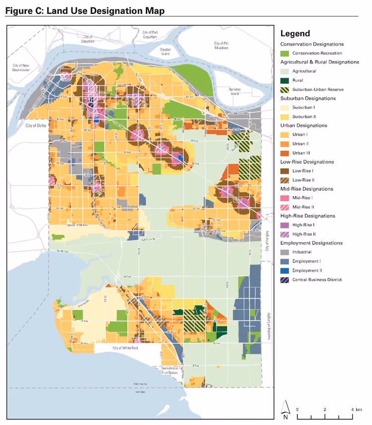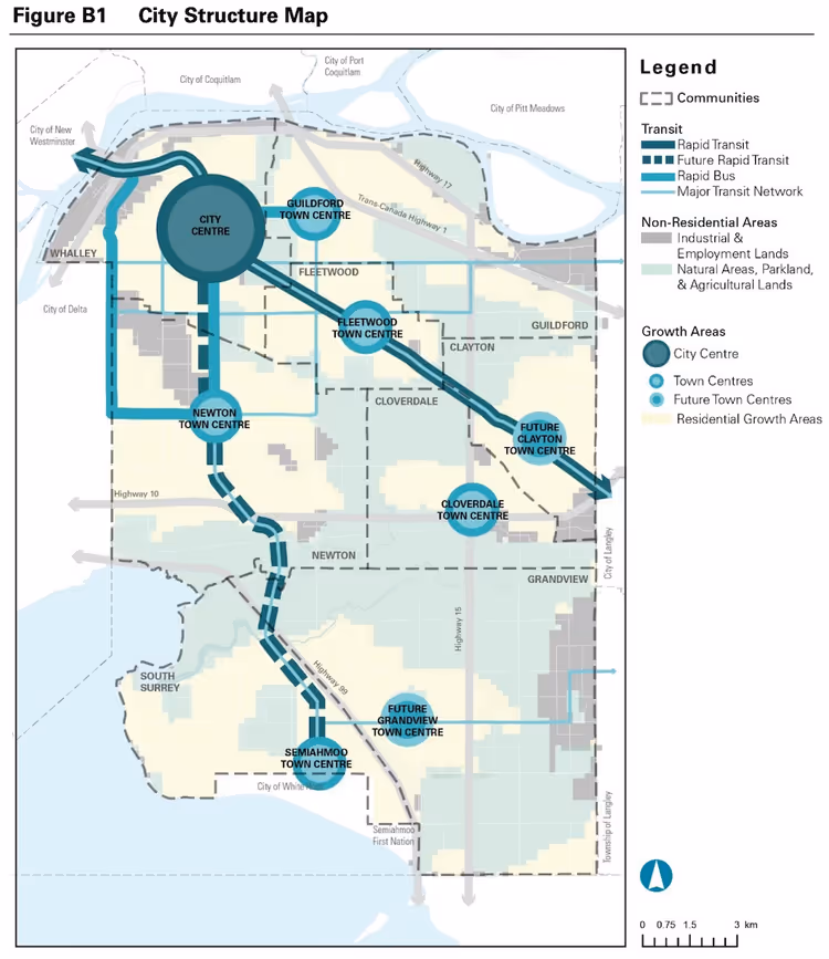 Surrey’s eight community hubs — including Surrey City Centre/Whalley, Guildford, Fleetwood, Newton, Cloverdale, Clayton, Grandview, and Semiahmoo — will continue to anchor planning decisions, where housing, amenities, and services are expected to be concentrated.